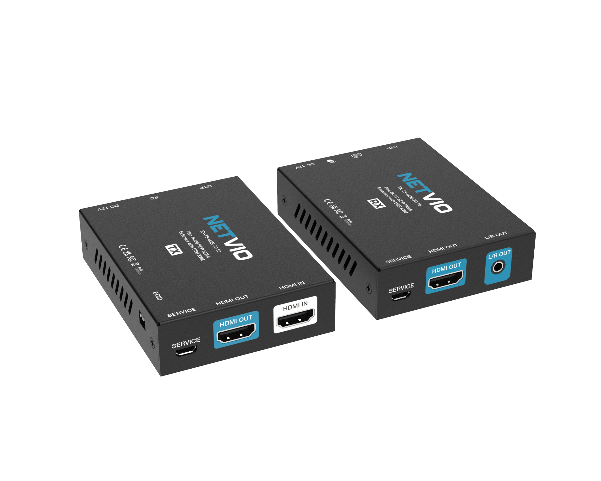 The Netvio EX-TS-USB-70-10 is a high-performance HDMI & USB KVM extender, engineered for premium residential and commercial AV installations. It delivers uncompressed 4K60 (4:4:4) video with zero latency and full USB 1.1 KVM functionality, allowing users to control connected computers remotely up to 70 metres over a single Cat6a/7 cable.