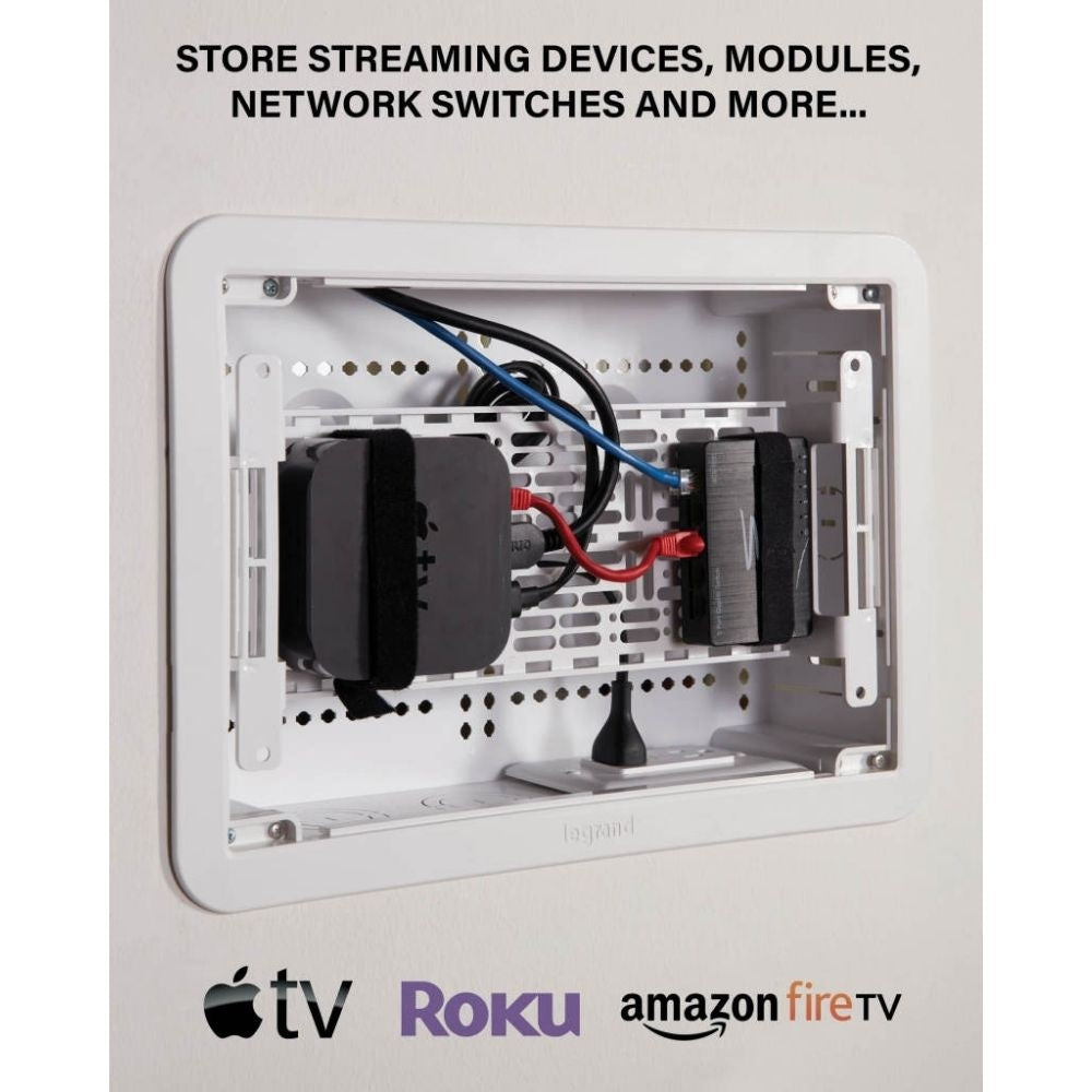The perfect solution directly behind any wall mounted TV to store streaming devices like Apple TV, Roku, Amazon Fire TV, network switches and more. This media in wall box features a 38mm / 1.5" elevation, which adds second layer of storage and accommodates larger devices.