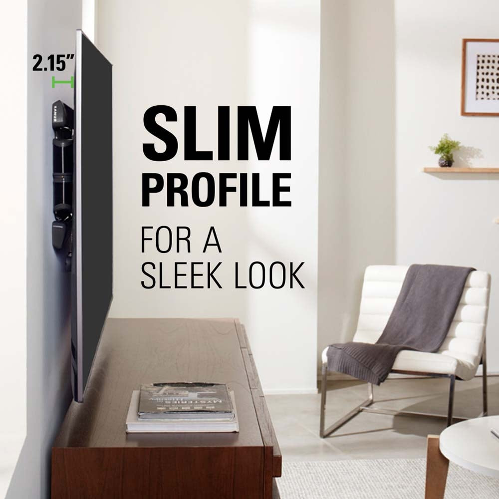 With a lower profile depth than traditional full motion mounts, the Advanced Full Motion Mount positions TVs closer to the wall creating a more streamlined look. This mount places the TV just 5.46cm or 2.15" from the wall for a streamlined look that complements today's sleek TVs and it also offers up to 15º of tilt and 57º of swivel left to right for a great picture and prefect viewing angle.