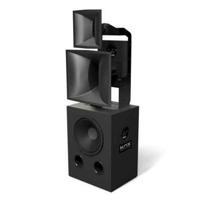 The horn assemblies are mounted to the bass cabinet with a solid mounting bracket which offers both vertical and horizontal tilt. The electronic filter network for the horn section is housed in a separate, well-ventilated enclosure, mounted at the rear of the midrange horn. Professional grade, close tolerance components ensure the system copes with the high sound pressure levels that well-recorded music and movies demand. A separate electronic crossover network is required between the bass driver and horn elements.