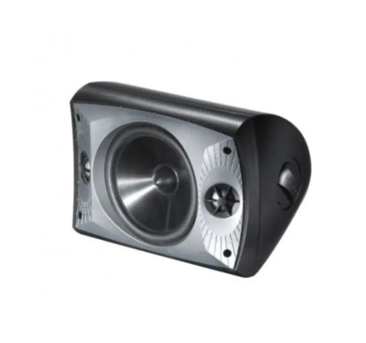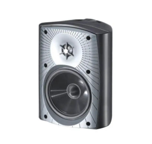 Compact weatherproof outdoor speaker with pure titanium tweeter and mineral-filled enclosure for high-fidelity sound.