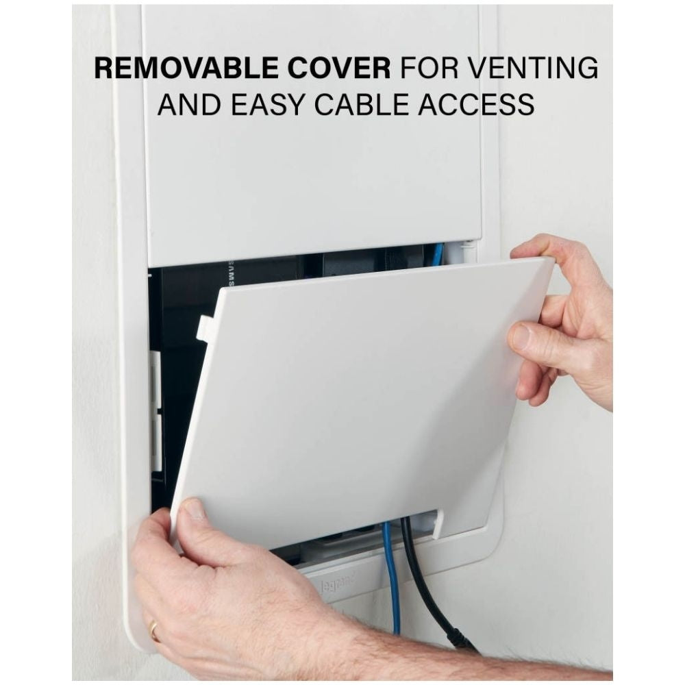 The perfect solution directly behind any wall mounted TV to store streaming devices like Apple TV, Roku, Amazon Fire TV, network switches and more. This media in wall box features a 38mm / 1.5" elevation, which adds second layer of storage and accommodates larger devices.